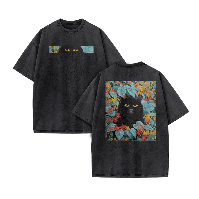 A Black Cat In A Field Of Blue Leaves Print Acid Washed T-shirt