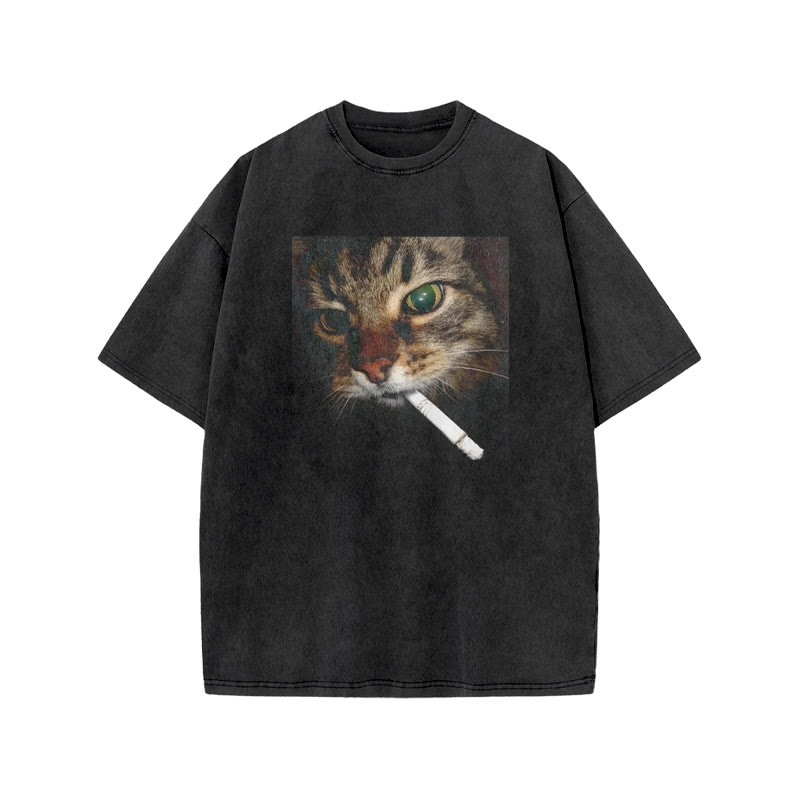Unisex Cat With Cigarette In Mouth Print Acid Washed T-shirt